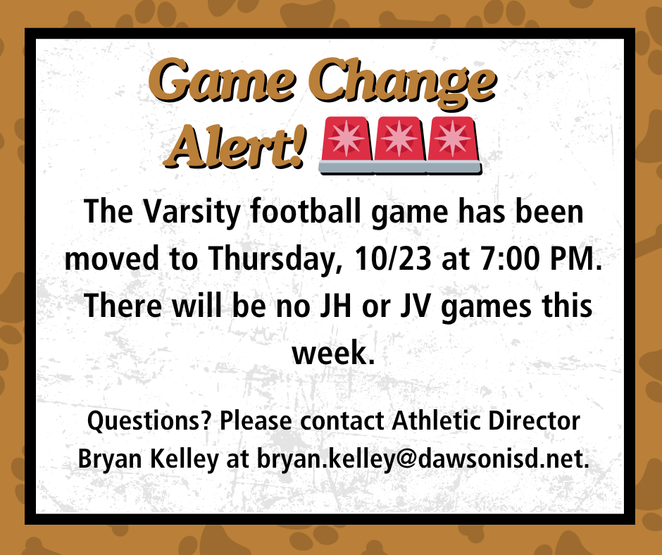 The Varsity football game has been moved to tomorrow at 7:00 PM.