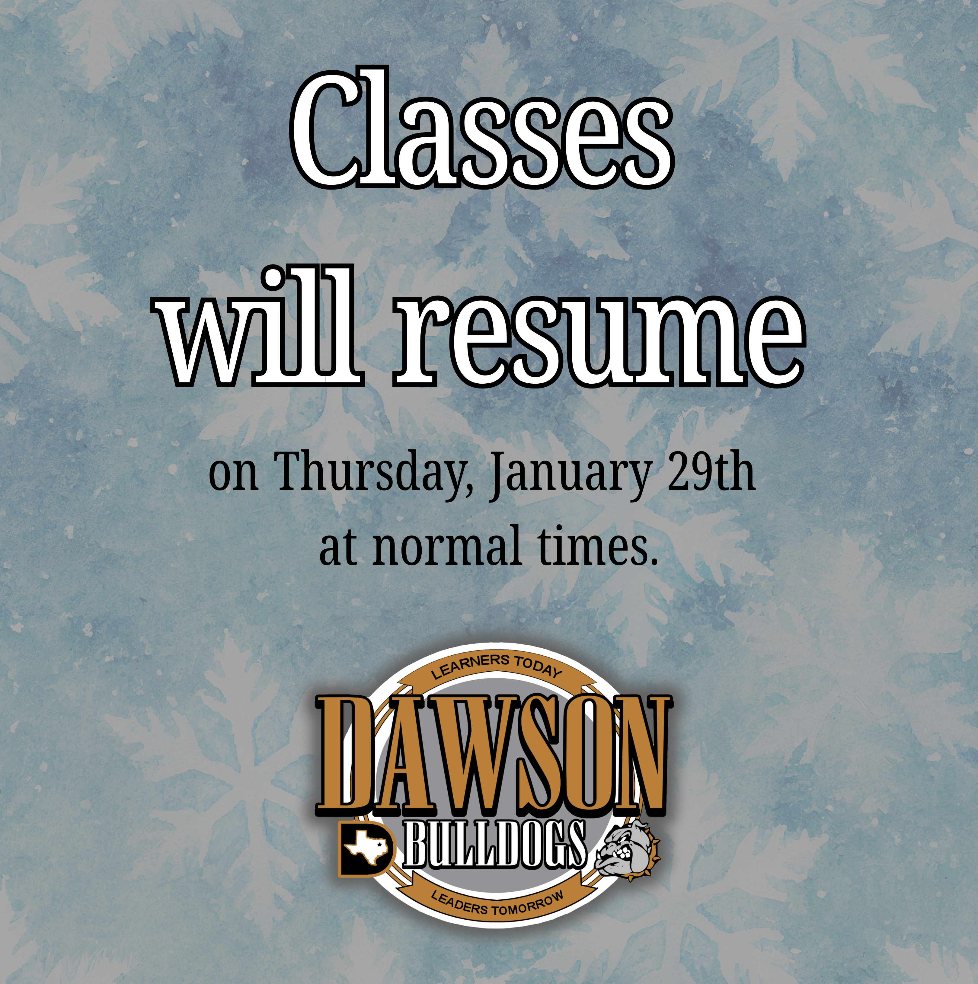 Dawson ISD classes will resume on a normal schedule on Thursday, January 29th.