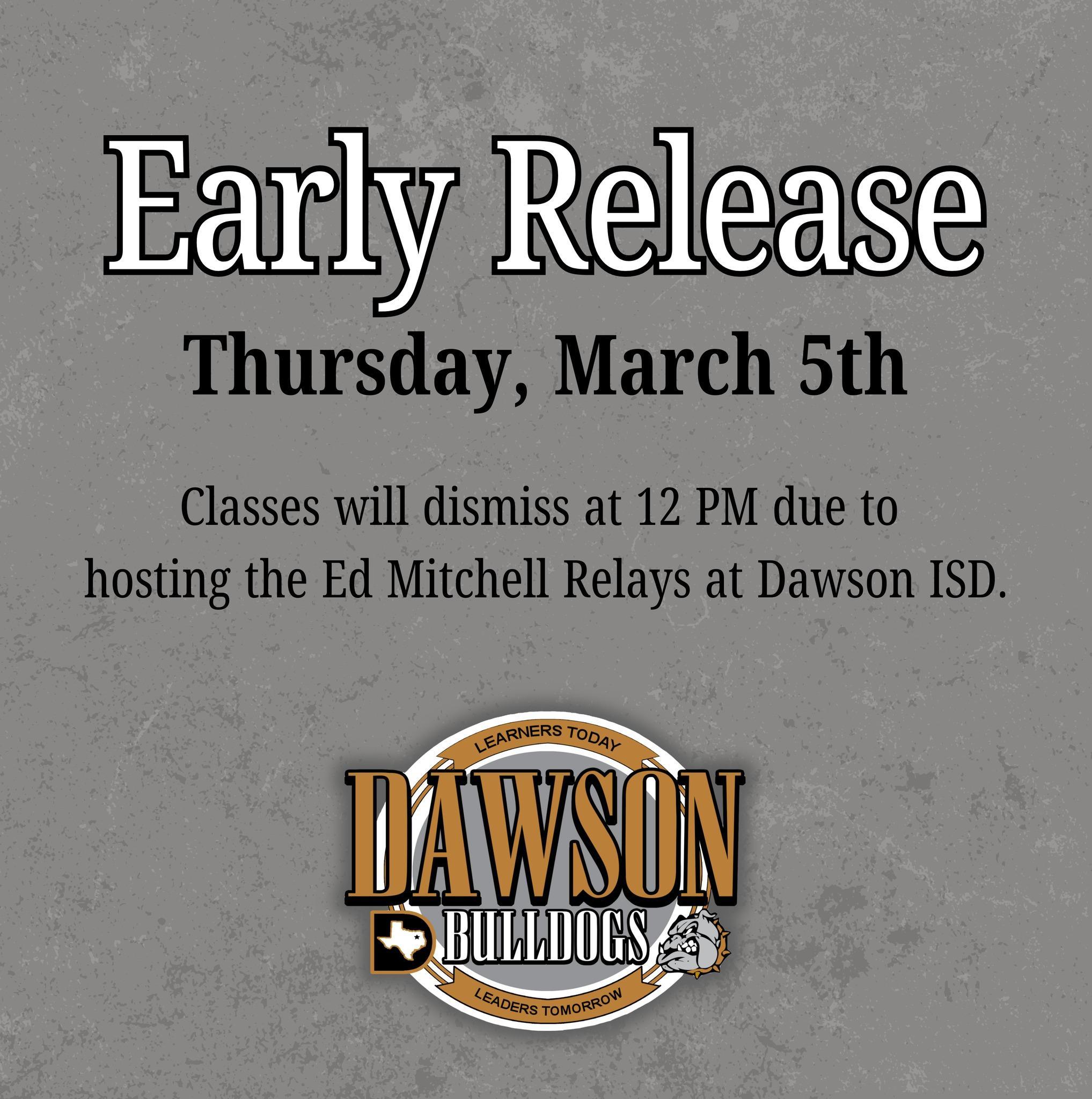 Dawson ISD will release at 12:00 PM (noon) next Thursday, March 5th due to hosting the Ed Mitchell Relays.